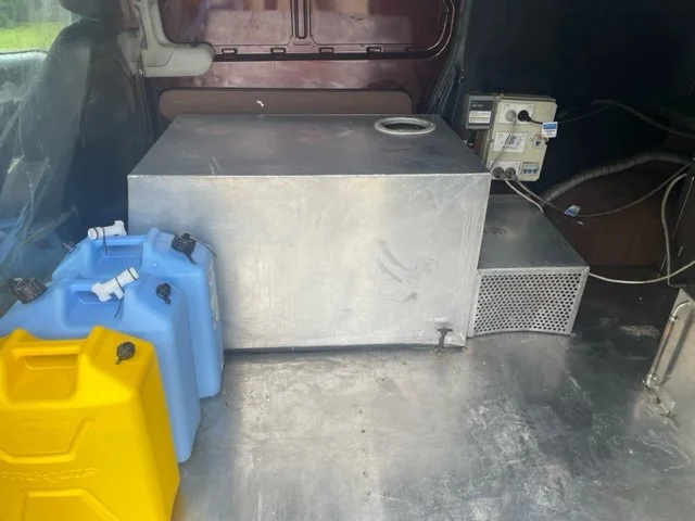 ✅ 2 x 20L Clean Water drums, 1 x 20L Deisel spare drum, Water Pump, Water Filter, External Water Inlet. All Hoses, Clamps, Fixtures and Fittings, Fire Extinguisher, 4 x Door Ventilation Units.
