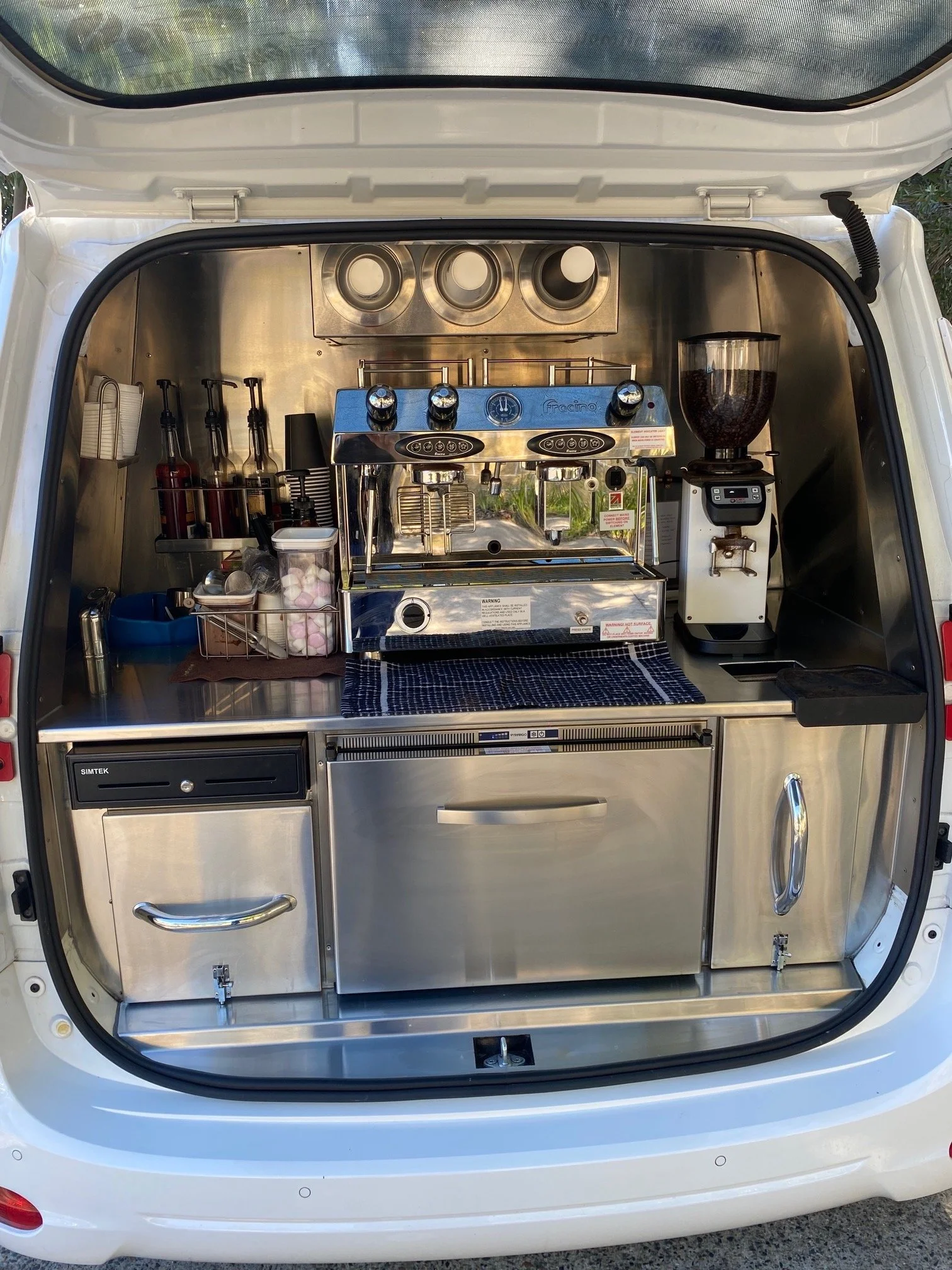 Under rear bench coffee fit-out includes; Storage drawers, cash till, in built knock box, 70L under counter drawer fridge